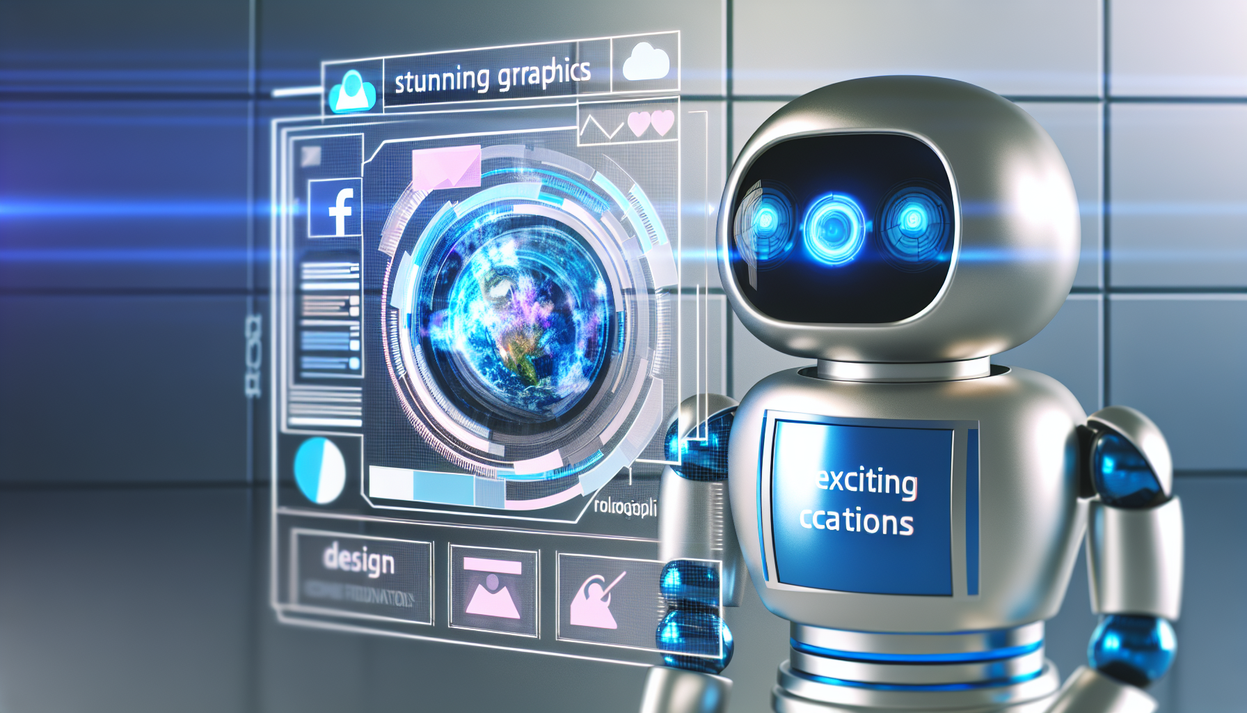 Ein Bild, das das Konzept der künstlichen Intelligenz darstellt, die Inhalte für soziale Medien erstellt. Es könnte ein massiver, futuristischer Roboter sein, der eine holographische Benutzeroberfläche verwendet, um beeindruckende Grafiken zu entwerfen, spannende Bildunterschriften zu schreiben und Beiträge zu planen. Dieser Roboter hat ein silbernes und blaues Äußeres und ein 'monitorähnliches' Gesicht, das grafische Daten anzeigt. Die holographische Benutzeroberfläche sollte verschiedene Designwerkzeuge sowie Logos von sozialen Medien anzeigen. Im Hintergrund sollte eine elegante, moderne Technologiearchitektur zu sehen sein.