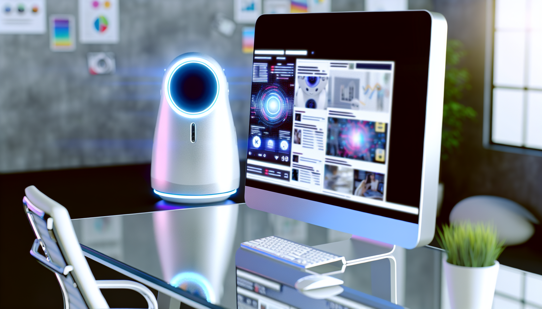 Eine KI-Maschine, die an einem Computer arbeitet und ansprechende Inhalte für soziale Medien generiert. Die KI-Maschine könnte ein schlankes, futuristisches Gerät sein, das sanft mit LED-Lichtern leuchtet. Auf dem großen, gebogenen Monitor vor ihr sind Einblicke in verschiedene Grafiken, Trends und ansprechende Beiträge zu sehen, die für soziale Medienplattformen entworfen wurden. Sie befindet sich in einem modernen Büroumfeld mit einem Glastisch, einem ergonomischen Stuhl und minimalistischer Dekoration.