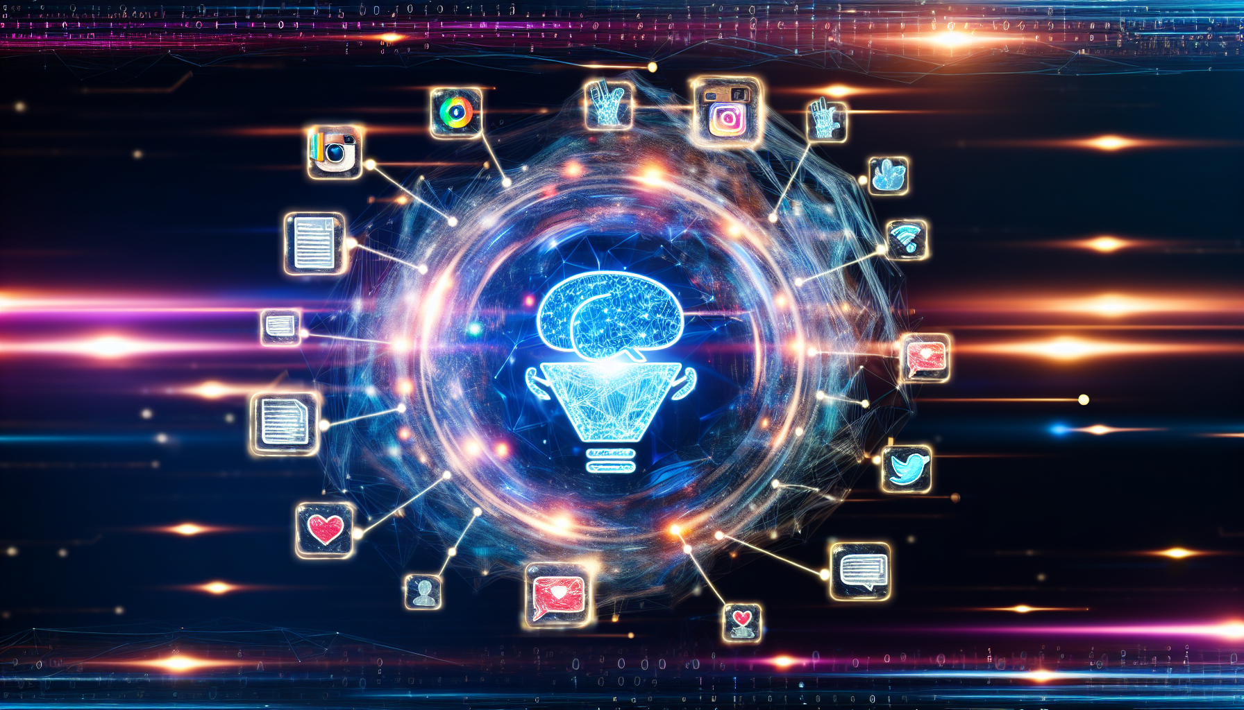 Erstellen Sie ein Bild, das den Prozess der Nutzung von künstlicher Intelligenz (KI) zur Generierung von Inhalten für soziale Medien darstellt. Das zentrale Element des Bildes sollte eine KI-Entität sein, die als futuristisches Computersystem mit leuchtenden Elementen dargestellt wird. Diese KI ist durch grafische Darstellungen verschiedener Arten von Inhalten für soziale Medien durchzogen: Blogbeiträge, Tweets, Instagram-Fotos, YouTube-Videos und andere. Diese Inhalte sind in einem halbtransparenten, digitalen Stil gezeichnet und erscheinen wie aus der KI hervorgegangene Kreationen. Der Hintergrund kann eine dynamische, hochmoderne Umgebung zeigen, die mit Lichtstrahlen, Binärcode und miteinander verbundenen Knoten gefüllt ist, um das globale Internet darzustellen.